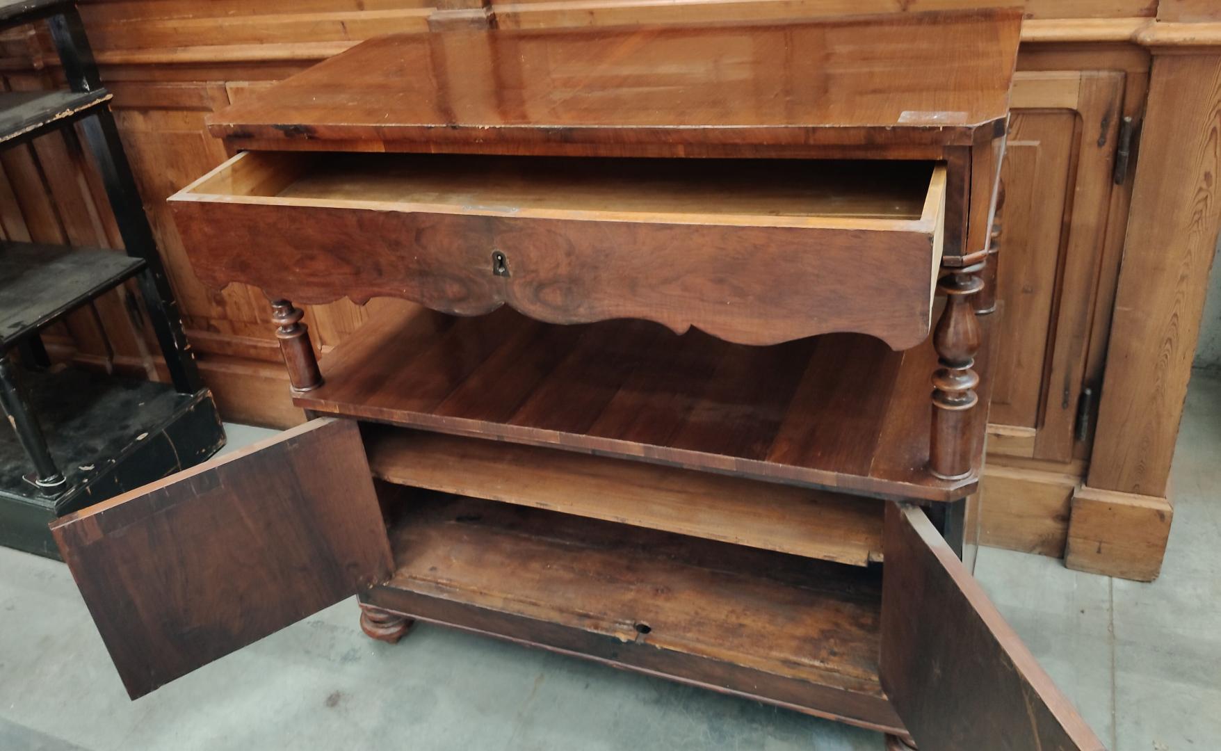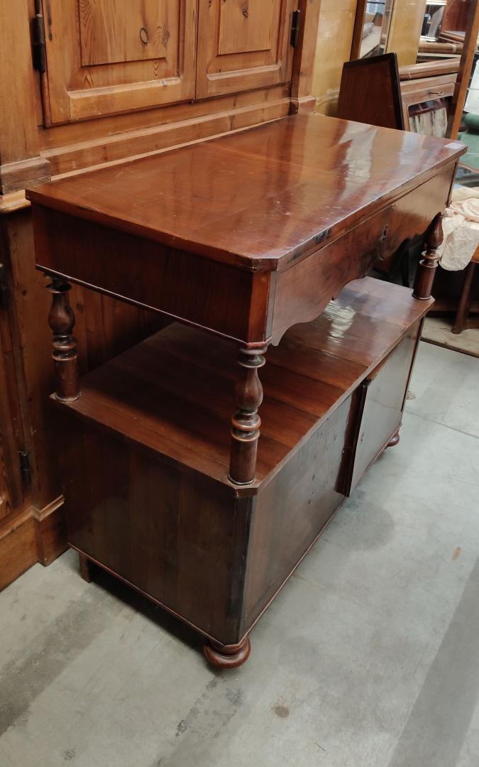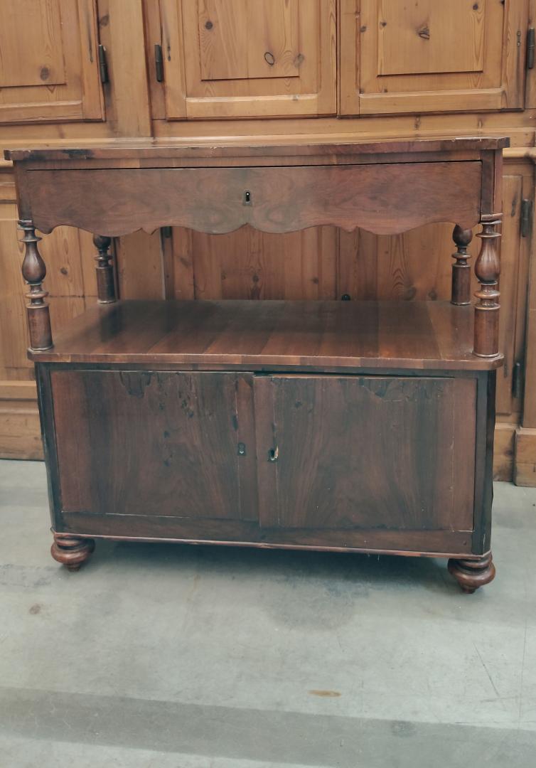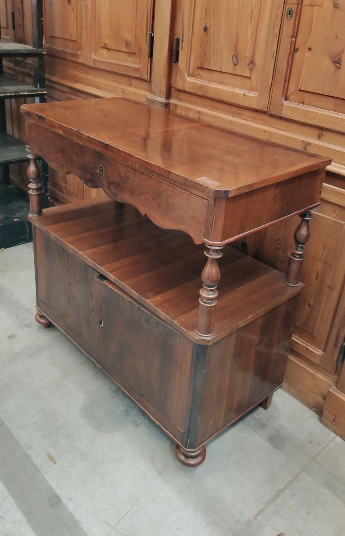Etagere in massello e lastronatura di noce, con cassetto e 2 sportelli sotto, fine 800