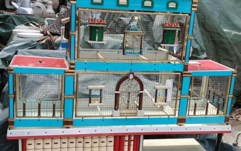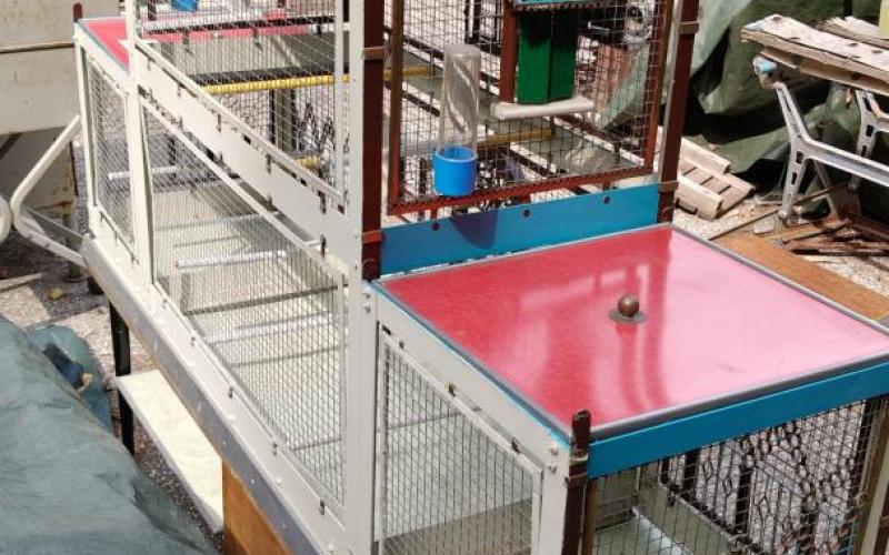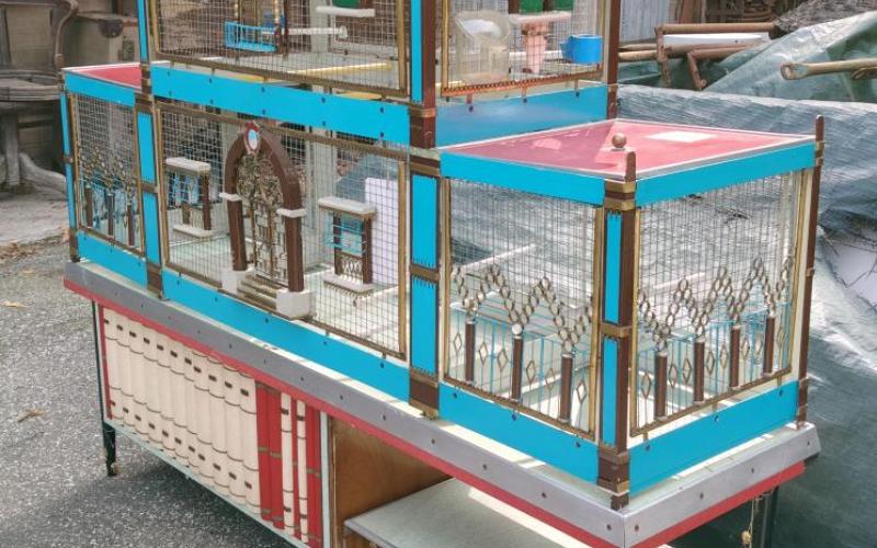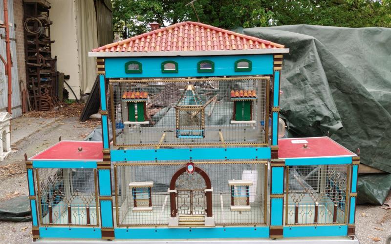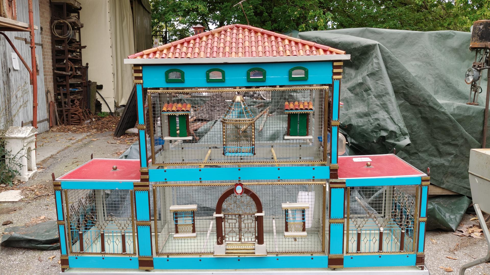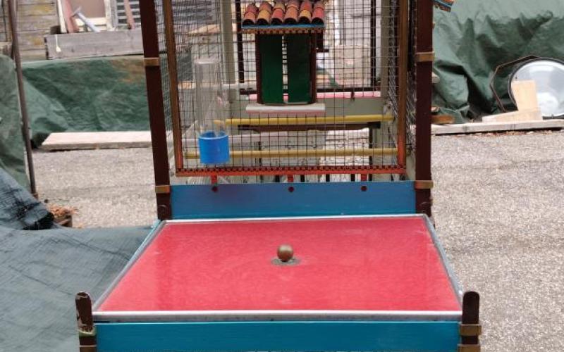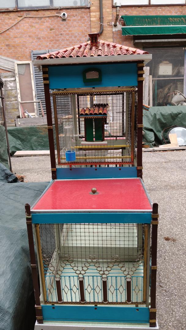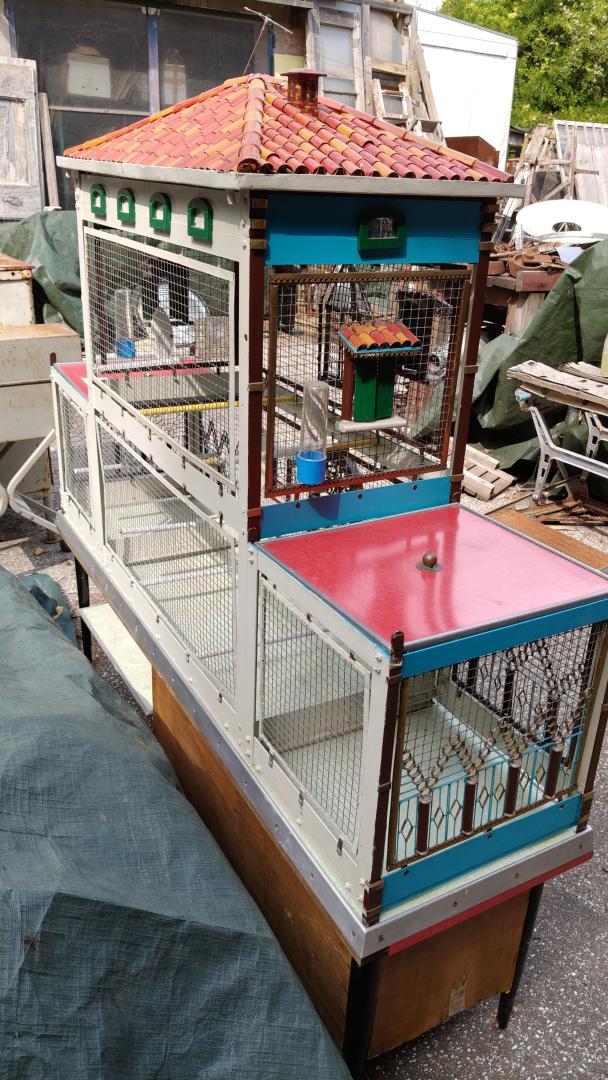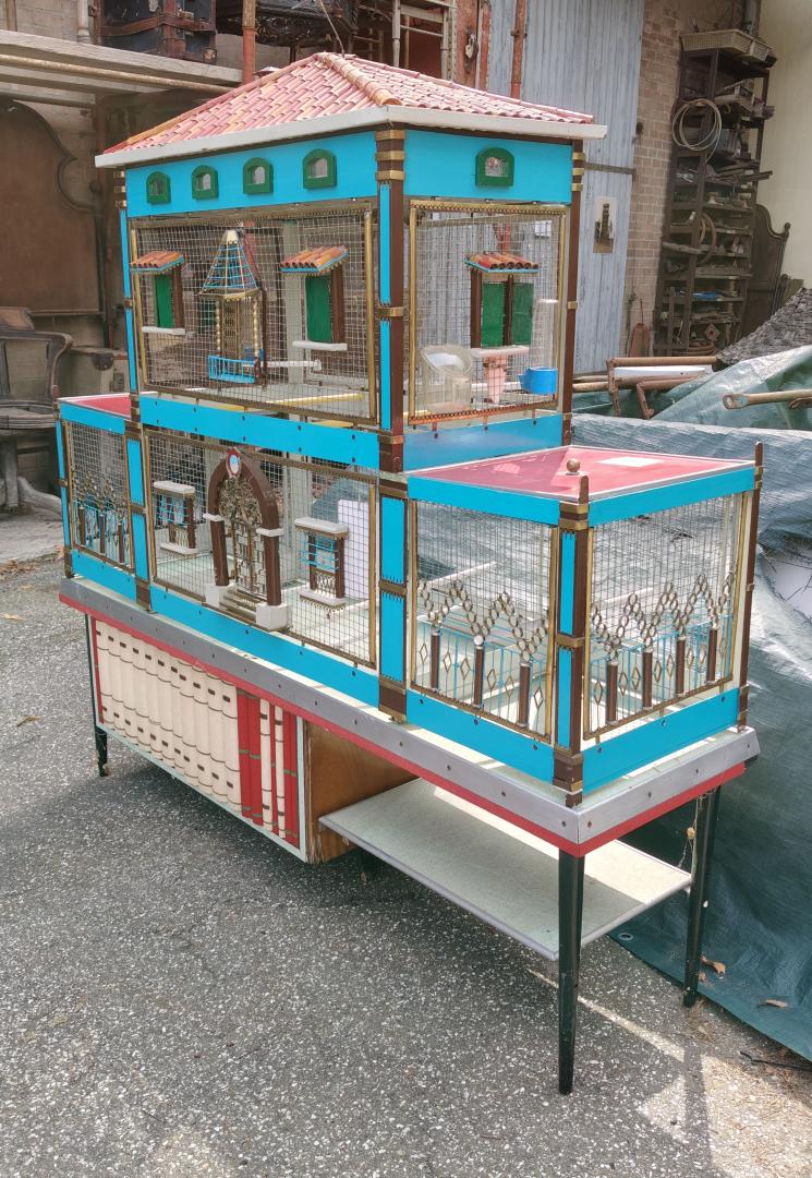 Grande voliera in ferro, formica colorata, su base tavolino in formica colorata legno e similpelle, anni 50